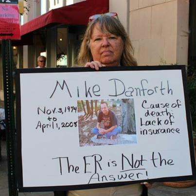 So, I stood with other protesters across from the line of people waiting to get in. One man jeeringly asked me what emergency room had turned my son away, so I told him. It was Memorial Health Center in Savannah, Ga. He sneered at me and turned away, so I went closer to the line. A police officer started to step in front of me and I told him I had no plans to cause trouble.
